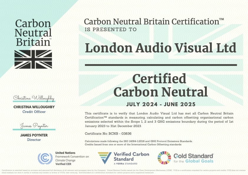 London Audio Visual is a certified Carbon Neutral Company! Our team have been working with Carbon Neutral Britain to calculate our Company’s total Carbon footprint. Our Company Directors decided to offset our carbon footprint to the Woodland fund. This project allows for trees to be planted in Countries which have been affected by deforestation, including South West Australia, Uruguay and Nicaragua.