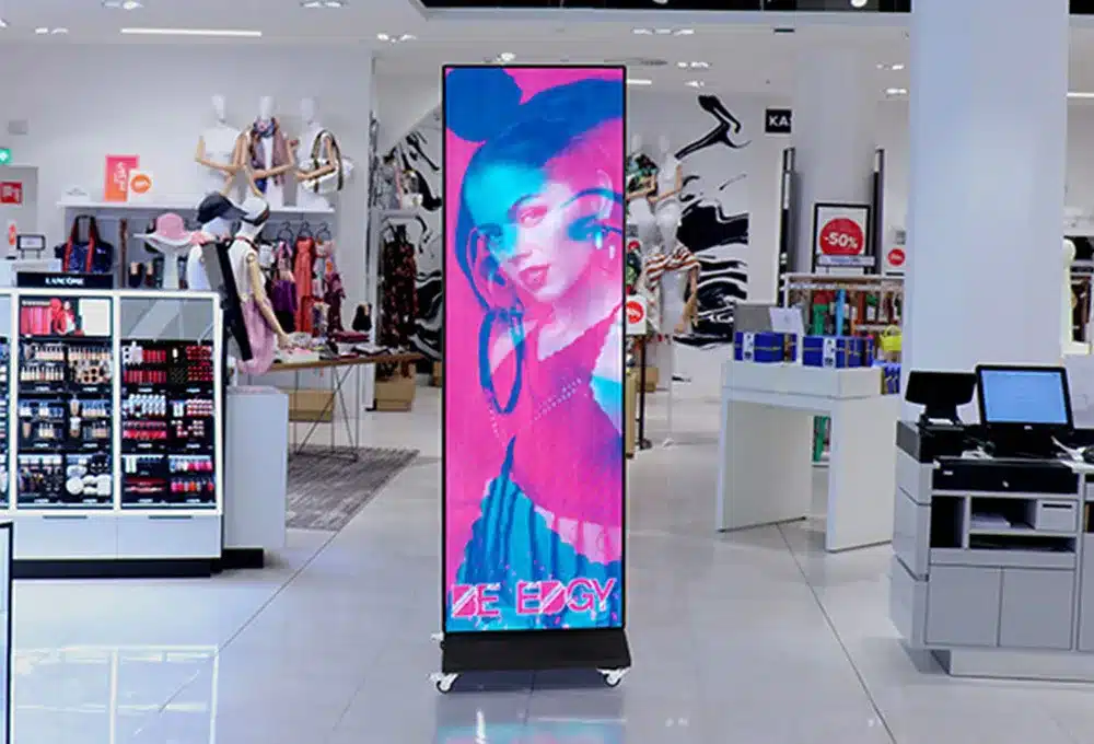 A poster LED or LED totem display screen designed to display dynamic content such as videos, images, and animation.